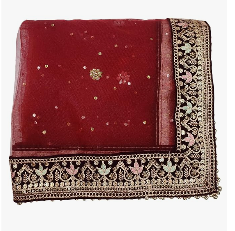 Net fabric also supports various design elements such as sequins, pearls, zari, and lace borders. Brides can choose pastel shades for daytime weddings or rich colors like red, maroon, and gold for traditional ceremonies. Due to its flexibility, this dupatta can be styled in multiple draping patterns such as single shoulder drape, double dupatta style, or cape-style draping.